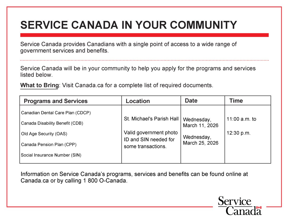 Service Canada will be at 310 Central Ave Hall on designated Wednesdays to help you apply for the programs and services listed below.